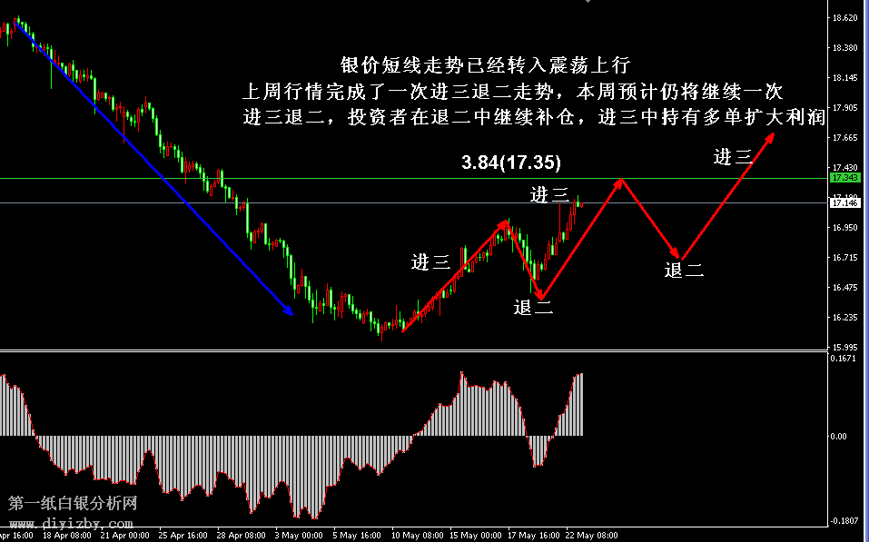 目前紙白銀價格是3.790克。昨日銀價開盤后便延續漲勢,正如我們所說,上周五行情強勢拉升收復了此前的回調,本周初銀價直接上漲沖擊3.84(17.35)附近的概率極大,投資者應繼續持有多單,并在任何回調中及時分批補倉。如下圖所示為白銀4小時周期走勢圖,正如圖中紅色箭頭所示,當前短線銀價已經進入震蕩上行,不過受制于前期大下跌趨勢的影響(藍色箭頭所示),行情將難以直接出現單邊拉升走勢,整體格局維持“進三退二”的上行步伐。我們只需要做的就是,當行情在“退二”中及時分批買入多單,當行情在“進三”中則堅定持有多單讓利潤奔跑,操作簡單但有條不紊,方能讓利潤最大化。由圖中可知,目前銀價距離第二阻力3.84(17.35)又再次僅差一步之遙,此時追多顯然不佳,建議持有多單為主,并在調整中及時補倉。另外,若銀價首先觸及3.84(17.35)附近,重倉多單投資者可適當減倉獲利,等待行情重新退二走勢出現后可再次買入多單,如此往復操作,我們便可在此輪波段行情中讓利潤奔跑起來,最終波段目標看至4.2(19)附近。綜合分析,當前無論是短期趨勢還是中期趨勢,均處于震蕩上行格局之中,因此當下唯一策略應是分批布局多單為主。即使銀價到達“進三”終點,等待其“退二”回踩后可繼續買入多單,切勿在退二過程中盲目做空,打亂進場節奏。(注: 由于紙白銀價格是國際銀價換算而來,而換算過程中涉及到人民幣對美元匯率的變化,即使在國際銀價不變化的情況下,如果人民幣貶值或升值,也會導致紙白銀價格出現變動。因此,我們的分析只采用最新的國際銀價對應的人民幣白銀價格,如與過去分析價格有出入, 投資者應知曉其原因。)