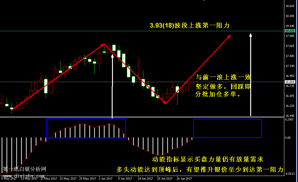 技術僅僅是基于概率論和統計學的一種綜合分析手段,絕非預測。所以技術分析是在考慮做好止損的情況下去博取大概率事件,投資不可過于迷信技術分析。(短線操作請一定做好止損,一旦被損,代表分析師基于概率和統計的技術分析不適用于當前行情) 1、紙白銀短線看點位,中線做方向。 2、以上所有價格為工商銀行買入價,即紙白銀低價。進倉點位要再加點差(各銀行點差不一),出倉則不要。 3、第一紙白銀給出的所有建議僅供投資者參考,不作為下單絕對依據,切勿過于依賴。 4、北京時間09:00發布此文章。 5、上一交易日白銀價格分析情況:(6月28日)白銀新一輪上漲將開啟 積極布局趨勢多單