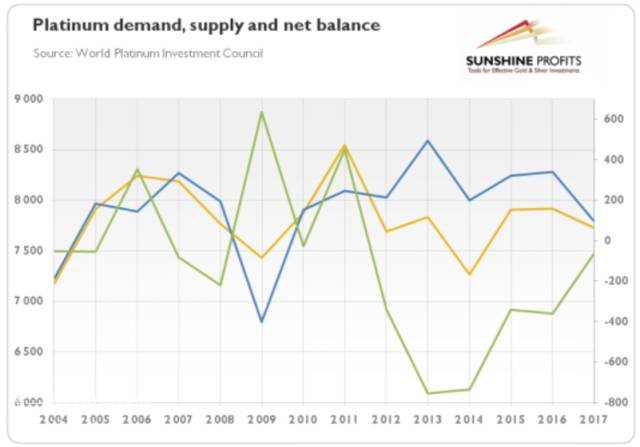 圖2:2004年到2017年鉑金需求(藍線,左軸,千盎司),鉑金供應(黃線,左軸,千盎司),凈余額(綠線,右軸,千盎司)(2017年是預估值)。