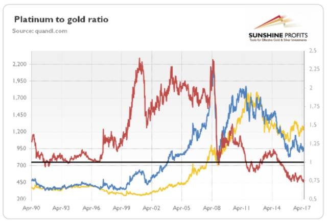 圖1:鉑金與黃金的比例(鉑金價格除以黃金價格,紅線,右軸),黃金價格(黃線,左軸,倫敦下午定盤價,周均價),以及1990年4月至2017年6月期間鉑金價格(藍線,左軸,倫敦下午定盤價,周均價)。