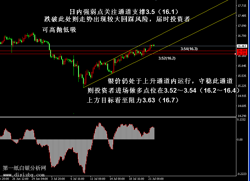 技術僅僅是基于概率論和統計學的一種綜合分析手段,絕非預測。所以技術分析是在考慮做好止損的情況下去博取大概率事件,投資不可過于迷信技術分析。(短線操作請一定做好止損,一旦被損,代表分析師基于概率和統計的技術分析不適用于當前行情) 1、紙白銀短線看點位,中線做方向。 2、以上所有價格為工商銀行買入價,即紙白銀低價。進倉點位要再加點差(各銀行點差不一),出倉則不要。 3、第一紙白銀給出的所有建議僅供投資者參考,不作為下單絕對依據,切勿過于依賴。 4、北京時間07:30發布此文章。 5、上一交易日白銀價格分析情況:(7月21日)白銀短線買盤力量減弱 上漲緩慢防止調整