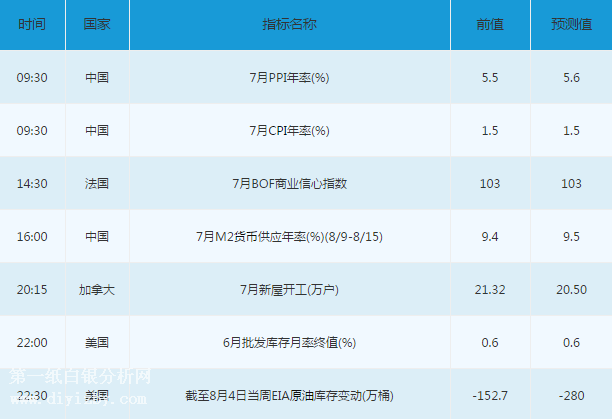 8月9日亞洲盤前,投資者首先關注04:30公布的美國截至8月4日當周API原油庫存變動(萬桶)。06:00澳洲聯儲助理主席肯特(Christopher Kent)發表講話。亞盤時段,9:30公布中國7月PPI年率和CPI年率。