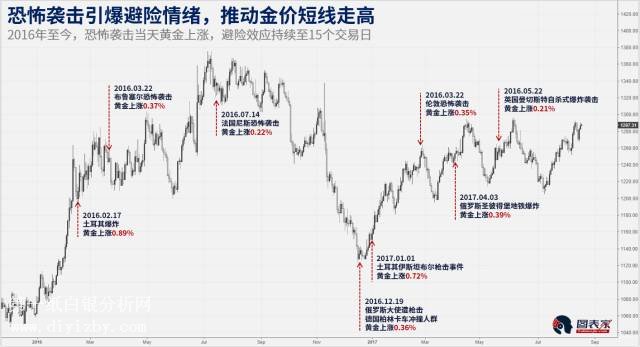 當全球發生恐怖襲擊事件后,黃金價格到底能上漲多少?這個問題我們需要從最近兩年的恐怖襲擊的金價漲幅數據做統計,而后根據統計結果得出答案。 從近兩年黃金市場走勢看,恐怖襲擊當天金價均上漲,黃金避險效應持續近15個交易日。 從不同國家的恐襲對黃金提升作用來看。土耳其恐襲提升作用最大。2016年2月,12月,1月三次土耳其恐襲后,黃金分別上漲了0.89%、0.36%和0.72%。 而法國恐襲對黃金提振較弱,2016年7月,造成重大人員傷亡的尼斯恐襲后,黃金上漲了0.22%。 可以看出,近兩年恐怖襲擊對于黃金都起到了積極的作用,原因是避險情緒的上升,上升幅度雖然只有不到1%,到也有10美元左右的漲幅,整體支撐效果還是不錯的。 2017年8月18日巴薩羅那恐怖襲擊 金價漲幅0.87%。 2017年8月18日西班牙巴塞羅那最知名的蘭布拉大道(Las Ramblas)發生一輛廂式貨車沖撞大批游客的攻擊事件,造成至少13人死亡,逾100人受傷。 伊斯蘭國宣稱對襲擊負責,西班牙警方正追緝在逃貨車司機,但是目前依然沒有鎖定恐怖分子去向。 周五(8月18日)歐洲市場開盤后,受到巴塞羅那恐襲影響,避險情緒再度蜂擁進入市場,金價受到推動,觸及1294.96美元/盎司水平。 這不僅刷新了黃金市場兩個月新高,更是進一步逼近年內高點1296美元/盎司。目前漲幅已經達到了0.87%。 更多紙白銀相關新聞請看:紙白銀行情新聞