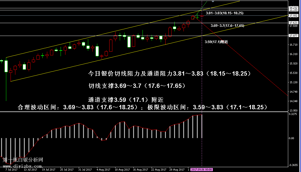 技術(shù)僅僅是基于概率論和統(tǒng)計學(xué)的一種綜合分析手段,絕非預(yù)測。所以技術(shù)分析是在考慮做好止損的情況下去博取大概率事件,投資不可過于迷信技術(shù)分析。(短線操作請一定做好止損,一旦被損,代表分析師基于概率和統(tǒng)計的技術(shù)分析不適用于當(dāng)前行情) 1、紙白銀短線看點位,中線做方向。 2、以上所有價格為工商銀行買入價,即紙白銀低價。進(jìn)倉點位要再加點差(各銀行點差不一),出倉則不要。 3、第一紙白銀給出的所有建議僅供投資者參考,不作為下單絕對依據(jù),切勿過于依賴。 4、北京時間08:00發(fā)布此文章。 5、上一交易日白銀價格分析情況:(9月5日)白銀看漲格局未改變 回補(bǔ)缺口時分批買入