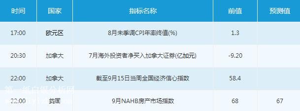 美國時段,投資者需關(guān)注20:30公布的加拿大7月海外投資者凈買入加拿大證券。此后,投資者可關(guān)注22:00公布的美國9月NAHB房產(chǎn)市場指數(shù)以及加拿大截至9月15日當(dāng)周全國經(jīng)濟信心指數(shù)。