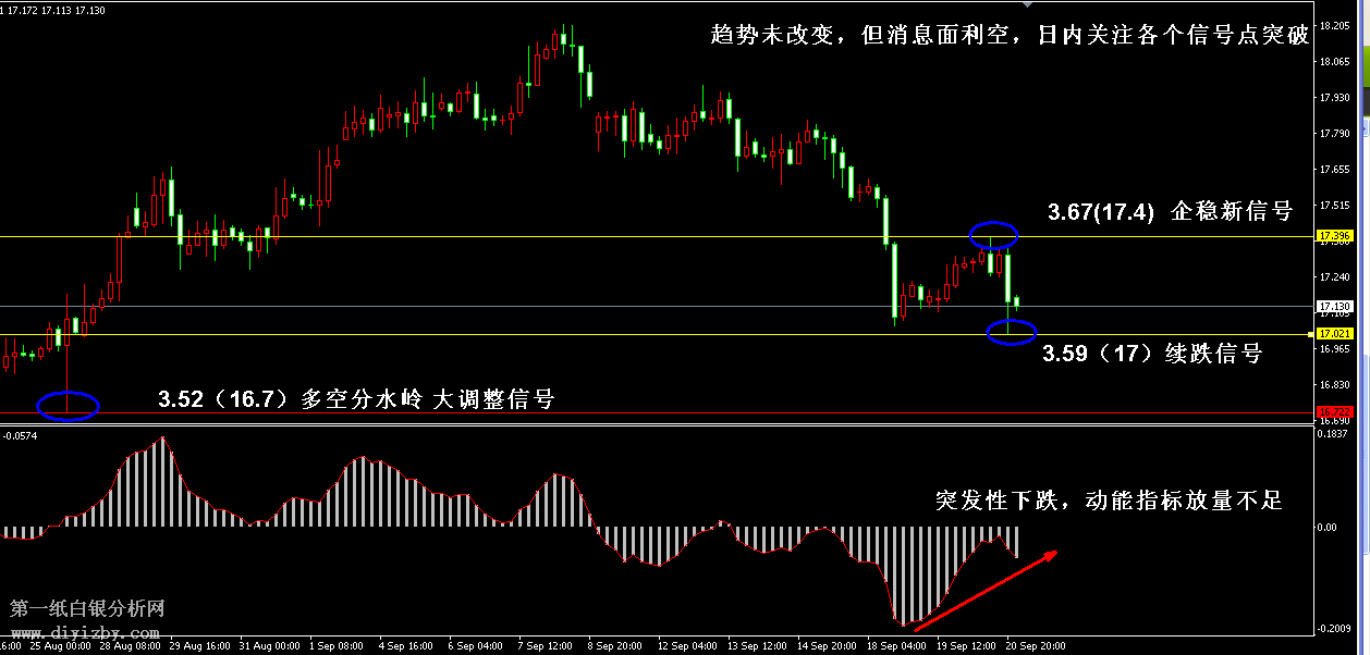 技術僅僅是基于概率論和統(tǒng)計學的一種綜合分析手段,絕非預測。所以技術分析是在考慮做好止損的情況下去博取大概率事件,投資不可過于迷信技術分析。(短線操作請一定做好止損,一旦被損,代表分析師基于概率和統(tǒng)計的技術分析不適用于當前行情) 1、紙白銀短線看點位,中線做方向。 2、以上所有價格為工商銀行買入價,即紙白銀低價。進倉點位要再加點差(各銀行點差不一),出倉則不要。 3、第一紙白銀給出的所有建議僅供投資者參考,不作為下單絕對依據(jù),切勿過于依賴。 4、北京時間08:00發(fā)布此文章。 5、上一交易日白銀價格分析情況:(9月20日)白銀觸底反彈驗證支撐 靜待企穩(wěn)信號出現(xiàn)