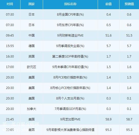 周五(9月29日)亞洲時段,投資者首先關注07:30公布的日本8月全國CPI年率。到了09:45,投資者可關注中國9月財新制造業PMI。