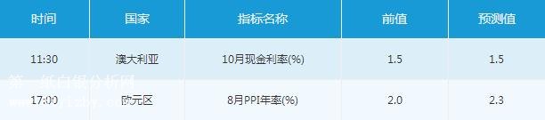 周二(10月3日)亞洲時段,投資者首先關注11:30公布的澳大利亞10月現金利率,以及澳洲聯儲公布利率決議。
