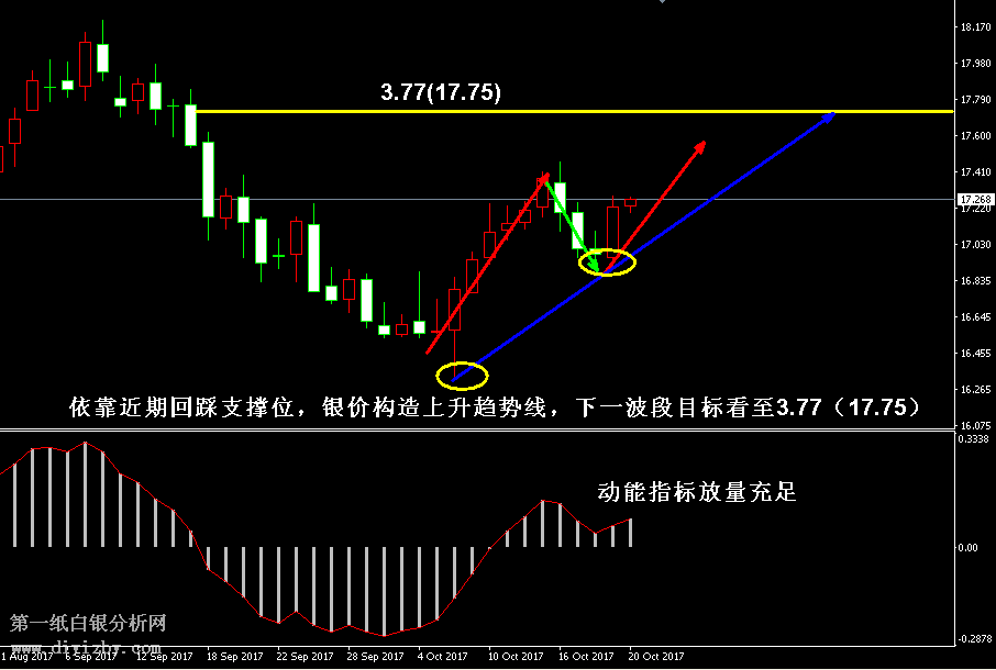 技術僅僅是基于概率論和統計學的一種綜合分析手段,絕非預測。所以技術分析是在考慮做好止損的情況下去博取大概率事件,投資不可過于迷信技術分析。(短線操作請一定做好止損,一旦被損,代表分析師基于概率和統計的技術分析不適用于當前行情) 1、紙白銀短線看點位,中線做方向。 2、以上所有價格為工商銀行買入價,即紙白銀低價。進倉點位要再加點差(各銀行點差不一),出倉則不要。 3、第一紙白銀給出的所有建議僅供投資者參考,不作為下單絕對依據,切勿過于依賴。 4、北京時間08:10發布此文章。 5、上一交易日白銀價格分析情況:(10月19日)白銀強支撐位現底背離 關注多頭趨勢回歸