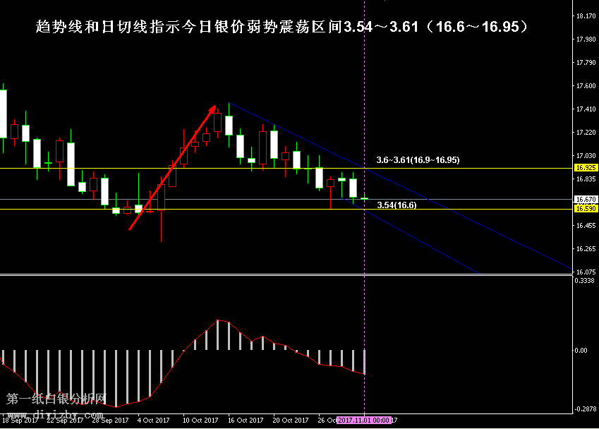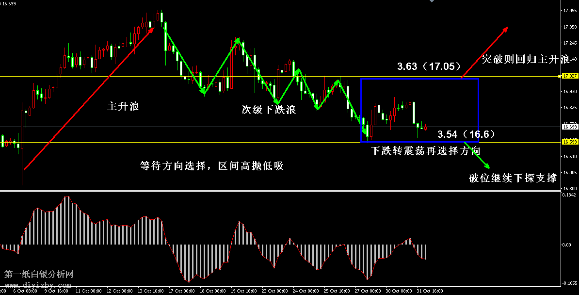 技術僅僅是基于概率論和統計學的一種綜合分析手段,絕非預測。所以技術分析是在考慮做好止損的情況下去博取大概率事件,投資不可過于迷信技術分析。(短線操作請一定做好止損,一旦被損,代表分析師基于概率和統計的技術分析不適用于當前行情) 1、紙白銀短線看點位,中線做方向。 2、以上所有價格為工商銀行買入價,即紙白銀低價。進倉點位要再加點差(各銀行點差不一),出倉則不要。 3、第一紙白銀給出的所有建議僅供投資者參考,不作為下單絕對依據,切勿過于依賴。 4、北京時間08:40發布此文章。 5、上一交易日白銀價格分析情況:(10月31日)白銀驗證支撐有效性 近期走勢或引發變盤