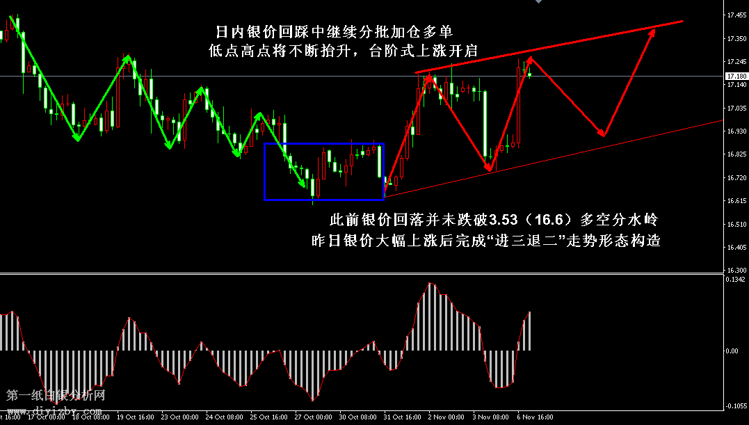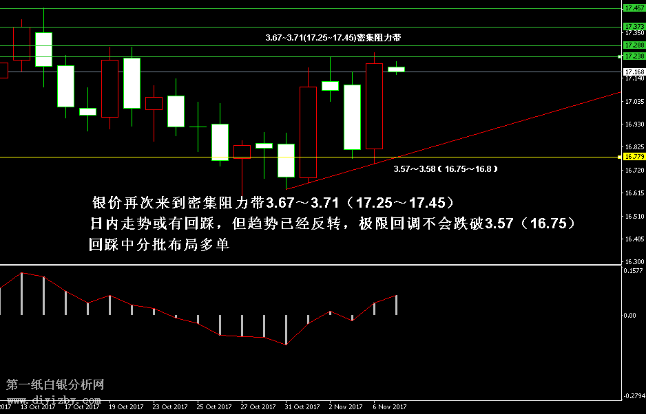 技術(shù)僅僅是基于概率論和統(tǒng)計(jì)學(xué)的一種綜合分析手段,絕非預(yù)測(cè)。所以技術(shù)分析是在考慮做好止損的情況下去博取大概率事件,投資不可過(guò)于迷信技術(shù)分析。(短線操作請(qǐng)一定做好止損,一旦被損,代表分析師基于概率和統(tǒng)計(jì)的技術(shù)分析不適用于當(dāng)前行情) 1、紙白銀短線看點(diǎn)位,中線做方向。 2、以上所有價(jià)格為工商銀行買(mǎi)入價(jià),即紙白銀低價(jià)。進(jìn)倉(cāng)點(diǎn)位要再加點(diǎn)差(各銀行點(diǎn)差不一),出倉(cāng)則不要。 3、第一紙白銀給出的所有建議僅供投資者參考,不作為下單絕對(duì)依據(jù),切勿過(guò)于依賴(lài)。 4、北京時(shí)間08:40發(fā)布此文章。 5、上一交易日白銀價(jià)格分析情況:(11月6日)白銀守穩(wěn)多空分水嶺 回落做多仍為主旋律