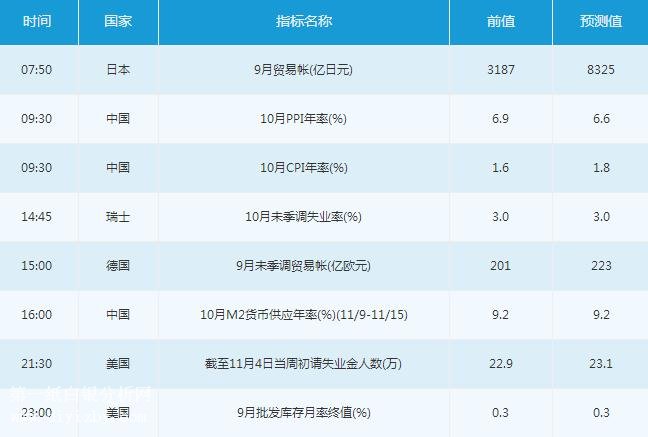 周四(11月9日)亞洲時段,投資者需關注07:50公布的日本9月貿易帳。此后,投資者需關注09:30公布的中國10月PPI年率、中國10月CPI年率。