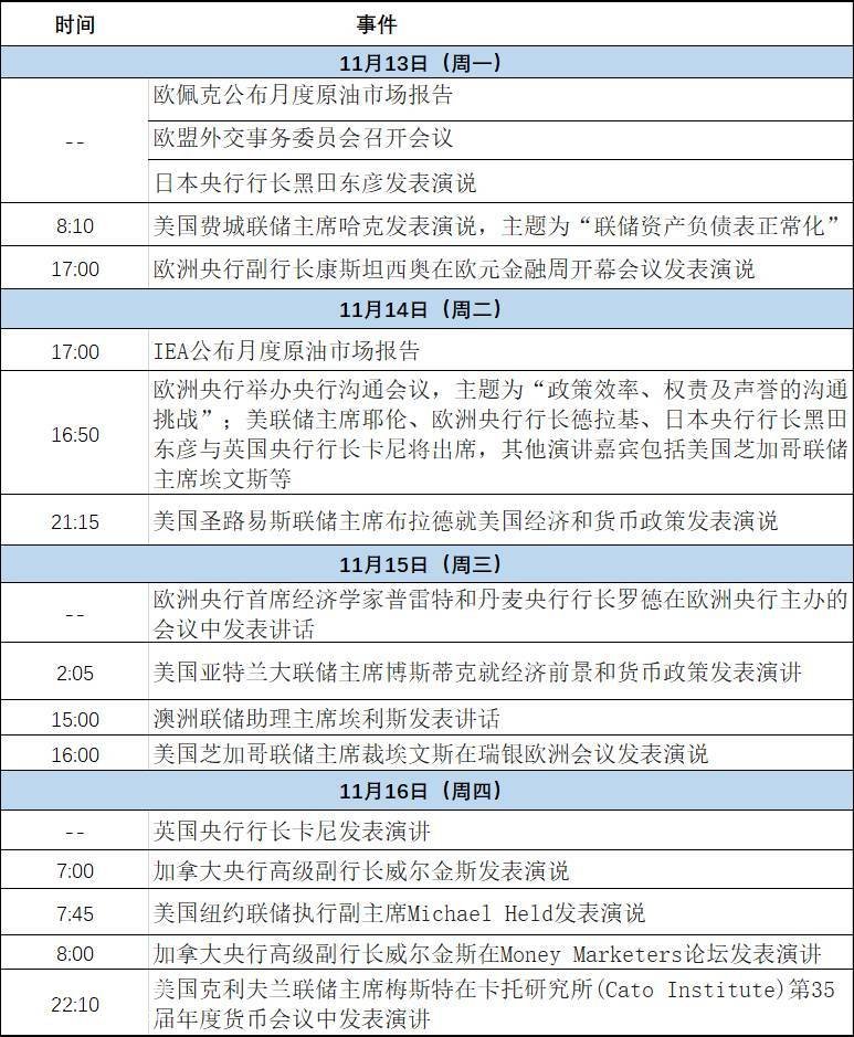 本周金融市場雖未公布重大經濟數據,但突發了諸多事件,其中美國稅改、沙特政局危機、特朗普亞洲之行牽動貴金屬市場神經。 展望下周,經濟數據方面,市場將迎來美國、加拿大、歐元區、英國的通脹數據,日本、歐元區、德國將發布GDP數據,英國和美國還將先后公布重磅零售銷售數據和PPI。 央行動態方面,多家央行官員將發表講話,周二美聯儲主席耶倫、歐洲央行行長德拉基、英國央行行長卡尼、日本央行行長黑田東彥發表講話,周四英國央行行長卡尼發表演講,周五歐洲央行行長德拉基、德國央行行長魏德曼、德意志銀行執行長克萊恩將出席銀行業會議并發表演說。 下周消息數據前瞻 周一北京時間下早八點10分費城聯儲主席在日本發表主題為“聯儲資產負債表正常化”演說。 下午OPEC將于奧地利維也納公布月度原油市場報告。 周二下午4點05分芝加哥聯儲主席埃文斯將在德國法蘭克福歐洲央行舉行的央行溝通會議上發表演講。 稍后5點鐘于法國巴黎EIA公布月度原油市場報告。 18點鐘美聯儲主席耶倫、歐洲央行行長德拉基、英國央行行長盧卡尼、日本央行行長盧卡尼將在德國法蘭克福發表講話。 周三下午4點鐘,芝加哥聯儲主席埃文斯在英國倫敦就經濟發表講話。 周四晚上9點10分達拉斯聯儲主席卡普蘭出席CFA問答活動,晚些時候英國行長盧卡尼將于不確定時間在利物浦發表演講。 周五凌晨4點45分,美聯儲理事布雷納德將在一場金融穩定會議中發表演說。 晚些不確定時間歐央行行長德拉基、德國央行行長魏德曼、德意志銀行執行長克萊恩于法蘭克福出席銀行會議并發表演講。 下周經濟數據一覽