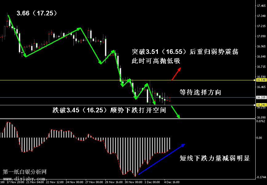 技術僅僅是基于概率論和統計學的一種綜合分析手段,絕非預測。所以技術分析是在考慮做好止損的情況下去博取大概率事件,投資不可過于迷信技術分析。(短線操作請一定做好止損,一旦被損,代表分析師基于概率和統計的技術分析不適用于當前行情) 1、紙白銀短線看點位,中線做方向。 2、以上所有價格為工商銀行買入價,即紙白銀低價。進倉點位要再加點差(各銀行點差不一),出倉則不要。 3、第一紙白銀給出的所有建議僅供投資者參考,不作為下單絕對依據,切勿過于依賴。 4、北京時間08:45發布此文章。 5、上一交易日白銀價格分析情況:(12月4日)白銀下跌動能減弱 十字星后面臨方向選擇
