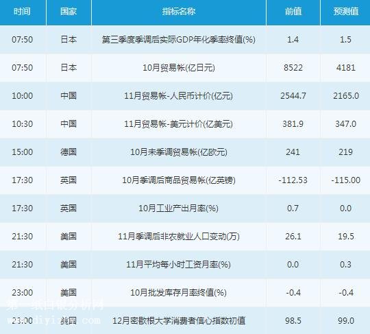周五(12月8日)亞洲時段,投資者可關注07:50公布的日本第三季度季調后實際GDP季率終值、日本10月貿易帳,10:00公布的中國11月貿易帳。