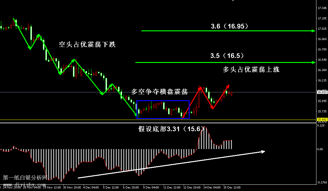 技術(shù)僅僅是基于概率論和統(tǒng)計學(xué)的一種綜合分析手段,絕非預(yù)測。所以技術(shù)分析是在考慮做好止損的情況下去博取大概率事件,投資不可過于迷信技術(shù)分析。(短線操作請一定做好止損,一旦被損,代表分析師基于概率和統(tǒng)計的技術(shù)分析不適用于當(dāng)前行情) 1、紙白銀短線看點位,中線做方向。 2、以上所有價格為工商銀行買入價,即紙白銀低價。進倉點位要再加點差(各銀行點差不一),出倉則不要。 3、第一紙白銀給出的所有建議僅供投資者參考,不作為下單絕對依據(jù),切勿過于依賴。 4、北京時間08:55發(fā)布此文章。 5、上一交易日白銀價格分析情況:(12月15日)白銀多空逐漸轉(zhuǎn)變 靜待回踩驗證是否反轉(zhuǎn)