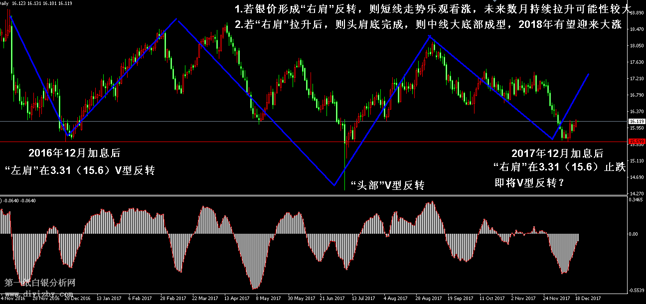 目前紙白銀價格是3.423元/克。昨日白銀價格繼續上漲,隨著行情向上突破3.43(16.15)的上周高點,銀價近期再度創出新高,這驗證了短線行情已開啟震蕩上行模式,同時確認了底部3.31(15.6)的反轉事實,一方面短線趨勢進入上漲,另一方面中長線走勢也將開啟拉升,這暗示未來幾個月銀價走勢將持續樂觀的可能性極大,目前價格正距離底部不遠,建議投資者應主要采取逢低做多思路為主。如下圖所示為白銀日線走勢圖,由于目前銀價筑底反轉可能性較大,且未來行情短線及中長線恐將開啟上漲,當下我們仍以中期趨勢分析,以幫助投資者更好的把握一輪波段及中線趨勢的到來。圖中藍線所示為2016年12月至2017年12月走勢形態,中線走勢跨度一年后終于有望形成“頭肩底”大底部,這為中長線牛市行情奠定了基礎。2016年12月美聯儲加息后,銀價在3.31(15.6)止跌企穩,而后行情迎來了連續性上漲,走勢圍繞3.31(15.6)發生V型反轉,恰恰是此時,行情悄悄奠定了“左肩”形態;2017年7月銀價出現短期內的快速砸盤,瞬間觸及3.05(14.35)的支撐位,而后迅速拉升,亦形成V型反轉,依靠此V型反轉,行情奠定了“頭部”形態;2017年12月歷史再度重演,與2016年12月一致,隨著美聯儲加息消息落地,銀價圍繞3.31(15.6)的相同位置發生止跌企穩,而隨著昨日行情向上突破3.43(16.15),超短線走勢已經形成了震蕩上漲的格局,這暗示日線走勢奠定了3.31(15.6)的底部,后市行情有較大概率圍繞該支撐形成反轉,并不排除行情再次發生V型反轉的可能性。目前的底部確立后,震蕩上漲形態將成為事實,則頭肩底的“右肩”形態將逐漸形成,這暗示未來幾個月銀價的反彈將以構造“右肩”為主,短線走勢在未來數月表現樂觀。另一方面,此次上漲與2016年12月還有一個明顯的區別,那就是2016年的上漲僅僅是左肩形態構造,并無中線底部特征支持;而2017年12月所形成的上漲是右肩形態構造,一旦構造完畢后,將形成中線“頭肩底”,該中線頭肩底是中長線行情正式開啟上升的信號,也是行情剛剛要拉升的特征。換言之,此輪短線銀價上漲完畢后,緊接著是一輪中長線行情的上漲,短線行情若如過去2016年持續3~4個月,則中線行情在頭肩底形成后或將持續更長時間,這暗示2018年的走勢將非常樂觀。在2018年第一個季度,銀價有望圍繞“右肩”形態上行,后面幾個季度,則銀價有望依靠中線“頭肩底”上行,顯然,當下是投資者布局短線、波段、中線、長線最佳進場時機。綜合分析:近期行情多空力量轉變特征非常明顯,結合歷史和主趨勢形態,我們認為一輪波段上漲即將開啟,等待波段上漲結束后,中長線底部又將形成,顯然上升空間是較大的。當下投資者應重點以逢低做多思路為主,由于當前價格距離底部較近,投資者可采取分批布局多單的方式加倉,止損可放大至中線支撐位3.25(15.3)下方較為穩健,只要銀價不跌破該點位,則“右肩”形態將仍然在構造中。(注: 由于紙白銀價格是國際銀價換算而來,而換算過程中涉及到人民幣對美元匯率的變化,即使在國際銀價不變化的情況下,如果人民幣貶值或升值,也會導致紙白銀價格出現變動。因此,我們的分析只采用最新的國際銀價對應的人民幣白銀價格,如與過去分析價格有出入, 投資者應知曉其原因。)