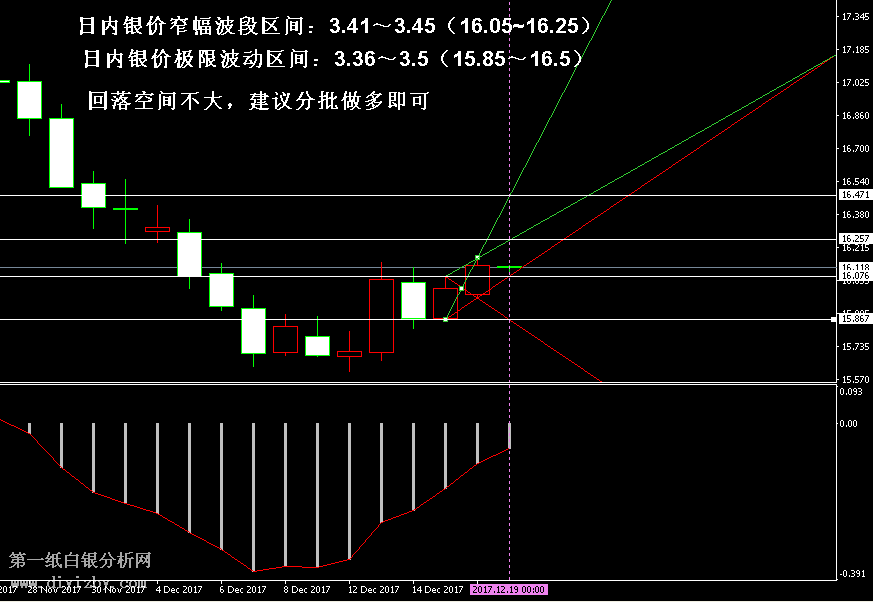 技術僅僅是基于概率論和統計學的一種綜合分析手段,絕非預測。所以技術分析是在考慮做好止損的情況下去博取大概率事件,投資不可過于迷信技術分析。(短線操作請一定做好止損,一旦被損,代表分析師基于概率和統計的技術分析不適用于當前行情) 1、紙白銀短線看點位,中線做方向。 2、以上所有價格為工商銀行買入價,即紙白銀低價。進倉點位要再加點差(各銀行點差不一),出倉則不要。 3、第一紙白銀給出的所有建議僅供投資者參考,不作為下單絕對依據,切勿過于依賴。 4、北京時間08:55發布此文章。 5、上一交易日白銀價格分析情況:(12月18日)白銀圍繞底部緩慢拉升 趨勢反轉概率極大