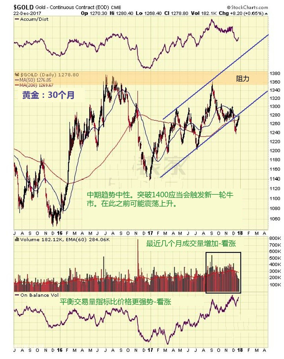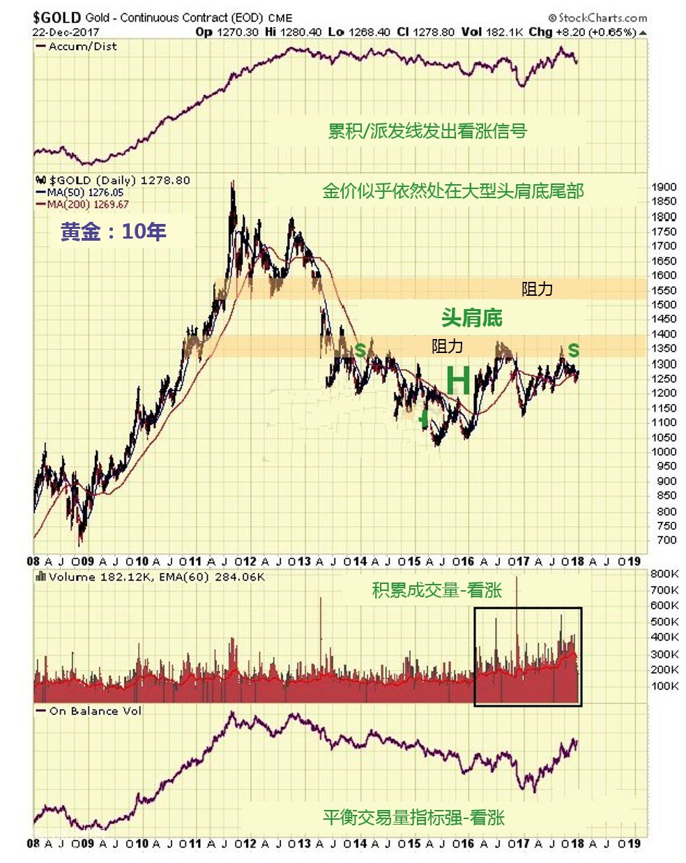 技術(shù)分析師Clive Maund表示,美元技術(shù)面看跌與黃金持倉結(jié)構(gòu)改善,為金價上漲鋪平道路。他認為,一旦金價突破1400,則意味著一段新牛市的開啟。 下圖為黃金10年日線走勢,價格目前處在頭肩底形態(tài)末尾,預計將現(xiàn)突破,這支持長期看漲的觀點。今年下半年累積的巨大交易量,以及交易量指標穩(wěn)步攀升,暗示黃金在積聚動能。若價格突破1400,則將意味著大型底部的形成,價格將步入一個新的牛市階段。 下圖為黃金30個月日線走勢,價格在2015年末觸及上述頭肩底形態(tài)低點后急速走高,與黃金股表現(xiàn)一致,但之后在去年12月跌回頭肩底右肩低點。自此以后,價格穩(wěn)步攀升,試圖擺脫整個底部形態(tài)。當前階段最好將趨勢描述為中性,直到突破價格向上突破1400。可以確信的是,突破指日可待。 下圖為黃金6個月日線走勢,本月稍早價格在跌破1260支撐后跌至200日移動均線下方,但在過去一到兩周扭轉(zhuǎn)跌勢,升向1300附近的阻力區(qū)。 ![]() 黃金6個月走勢圖 ![]() 黃金持倉 ![]() ![]() 美元指數(shù)9個月走勢圖 ![]() 查看更多紙白銀相關(guān)新聞請看:紙白銀行情新聞