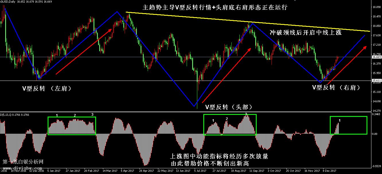 目前紙白銀價格是3.508元/克。昨日白銀價格仍維持強勢上漲,最高觸及3.51(16.7)阻力位,該點位正是日切線壓力,不過隨著時間推移,今日行情將擺脫在3.51(16.7)的壓制,日內走勢有望繼續向上沖擊更高的阻力。如下圖所示為白銀日線走勢圖,目前銀價正經歷主趨勢主導下的“V型反轉”+頭肩底形態下的右肩構造行情。主趨勢正如圖中紅色箭頭所示,因銀價主要趨勢仍處于上漲走勢之中,因此在過去幾輪反彈行情中,銀價在強支撐位附近都走出了V型反轉形態,此次走勢再次于強支撐3.28(15.6)止跌企穩,目前行情強勢拉升并未見到任何見頂和回調跡象,說明銀價再次走出V型反轉的意圖十分明顯;另外,頭肩底右肩的構造過程也幫助銀價維持V型反轉形態,圖中藍色線顯示了從2016年11月至2017年12月的走勢,銀價先后經歷了“左肩”V型反轉+“頭部”V型反轉,當前走勢正明顯構造“右肩”形態中,該右肩形態已經完成三分之二,其走勢正朝著再一次V型反轉行情運行。根據頭肩底形態來推測,右肩行情顯然是銀價強勢拉升前的最后一次調整,走勢若圍繞3.28(15.6)形成底部,則該點位有望成為未來一年內的最低點,不僅僅右肩構造過程中行情將維持上漲格局,當右肩上漲向上沖破圖中黃線所示頸線位置后,將宣布中線頭肩底正式構造完畢,屆時銀價有望開啟新一輪中線上漲行情。相對于當前的V型反轉短線上漲,一旦中線上漲行情開啟,則后市拉升幅度更大。另外,從動能指標的走勢形態也可以看出,短線上漲行情顯然還沒有結束,目前動能指標正進入零軸上方放量,但未見明顯縮量跡象,暗示短期內買盤力量仍然充足。另外,我們也可參考動能指標變化,找出銀價將繼續上漲的依據。若參考前兩次V型反轉和頭肩底結構的動能形態,可發現在銀價上漲過程中,動能指標往往經歷多次放量拉升,直至最終買盤力量衰竭后,行情才將向下運行。如圖中綠色框所示,過去兩輪上漲行中,伴隨銀價拉升,動能指標都經歷了3次沖高放量,而后銀價才結束漲勢,當前在走勢拉升過程中,動能指標正在進行第一次放量拉升,若假設三次放量拉升,則后市上漲空間顯然還很大,這足以幫助銀價向上沖擊并突破頸線壓力。綜合分析:種種跡象顯示,白銀正圍繞3.28(15.6)構造的底部不僅僅是短期底部,更有望幫助走勢在2018年迎來中期上漲行情。無論是短期上漲還是中期上漲,以當前價格做對比,其上漲空間都較大。目前投資者應堅定不移的持有多單和逢低加倉多單,若遇到走勢向下回踩支撐,則是投資者布局短線+中線多單的良好機會,只要嚴格止損3.28(15.6)下方,銀價不跌破該點位,則趨勢將不會被反轉。(注: 由于紙白銀價格是國際銀價換算而來,而換算過程中涉及到人民幣對美元匯率的變化,即使在國際銀價不變化的情況下,如果人民幣貶值或升值,也會導致紙白銀價格出現變動。因此,我們的分析只采用最新的國際銀價對應的人民幣白銀價格,如與過去分析價格有出入, 投資者應知曉其原因。)