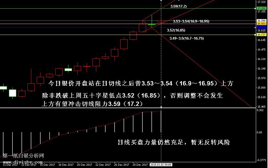 今日下方關(guān)鍵支撐位3.53~3.54(16.9~16.95)、3.49~3.5(16.7~16.75)、3.45(16.5)、3.41(16.35)、3.33~3.34(15.95~16)、3.28(15.6);今日上方關(guān)鍵阻力3.59(17.2)、3.68(17.6)。 技術(shù)僅僅是基于概率論和統(tǒng)計學(xué)的一種綜合分析手段,絕非預(yù)測。所以技術(shù)分析是在考慮做好止損的情況下去博取大概率事件,投資不可過于迷信技術(shù)分析。(短線操作請一定做好止損,一旦被損,代表分析師基于概率和統(tǒng)計的技術(shù)分析不適用于當(dāng)前行情) 1、文中價格為紙白銀價格,括號內(nèi)為國際銀價,投資者可雙向參考。 2、以上所有價格為工商銀行買入價,即紙白銀低價。進倉點位要再加點差(各銀行點差不一),出倉則不要。 3、第一紙白銀給出的所有建議僅供投資者參考,不作為下單絕對依據(jù),切勿過于依賴。 4、北京時間09:11發(fā)布此文章。 5、上一交易日白銀價格分析情況:(1月1日)白銀本周將繼續(xù)拉升 元旦假期今日休市