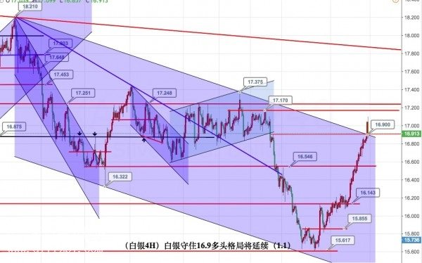 白銀強勢的多頭在15.8確認支撐后逐步走高,盤中企穩(wěn)16.55后上周五市場再度打破以18.2為高點的下降通道在16.9的關鍵阻力點,那么16.9也將從阻力轉變?yōu)橹危越酉聛矶囝^守住16.9保持低多看漲的思路不變,上方關注17.2-17.4區(qū)域的阻力點!