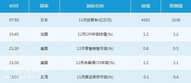 美國時段,投資者需關(guān)注21:30公布的美國12月零售銷售月率、美國12月未季調(diào)CPI年率。此后,投資者還需關(guān)注23:00公布的美國11月營運庫存月率。