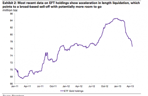 高盛Jeffrey Currie及其團隊對本周大宗商品拋售背后驅動因素的分析(當然上周高盛發出的看空黃金的報告不在其中): 對塞浦路斯央行將出售黃金儲備越來越多的擔憂觸發了黃金的大幅拋售,這可能反映市場對于其他歐洲央行更大規模出售黃金儲備的憂慮。隨后在突破關鍵的技術支撐位1530美元/盎司以及200日均線1434美元/盎司后,金價的下跌難以遏制,從而導致了最大規模的單日跌幅。黃金拋售的影響以及對歐洲和新興國家宏觀經濟的擔憂重現隨后也導致了原油和基礎金屬的拋售,拋售大部分集中在價格曲線的近段,由于遠端價格保持穩定,因此這壓縮了價差。 盡管黃金如今已低于我們此前報告中的1450美元/盎司的短期目標價位,但我們仍然維持我們看空金價的觀點,我們在上周的報告中也說過:隨著倉位的擠壓和市場情緒轉向看空,價格跌幅可能超出我們起初的設想。近期ETF持倉顯示出市場清盤動作的加快,這指向期貨市場大范圍的拋售仍然可能繼續。 我們相信基礎金屬比原油更接近底部。盡管我們繼續維持對原油和銅的三個月短期的看多,但基礎金屬組合可能比原油更接近底部,這就是我們停止看多原油但維持看多銅的原因。金屬價格目前的價位已經很低,更多的跌幅已開始對基本面產生大量影響來支持更高價格的水平。與基本所有的原油市場基本都處于現貨貼水的結構不同,上海的銅期貨市場仍然是現貨升水形態,滬銅和倫銅的套利窗口仍然開著,而且上海交易所和保稅區倉庫的庫存也在下降。關于原油,我們認為市場需要看到證據來判斷,近期市場的疲軟是由于季節性波動被夸大所致還是深層次的經濟基本面問題。 ETF持倉變化