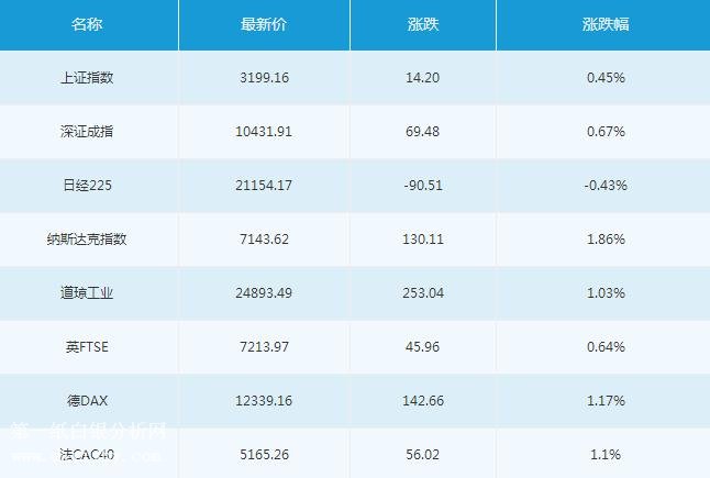 道瓊斯工業平均指數周二收盤上漲253.04點,漲幅1.03%,報24893.49點;標普500指數周二收盤上漲35.69點,漲幅1.34%,報2698.66點;納斯達克指數周二收盤上漲130.11點,漲幅1.86%,報7143.62點。
