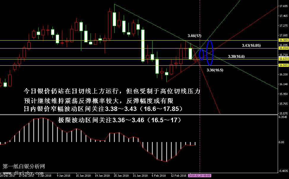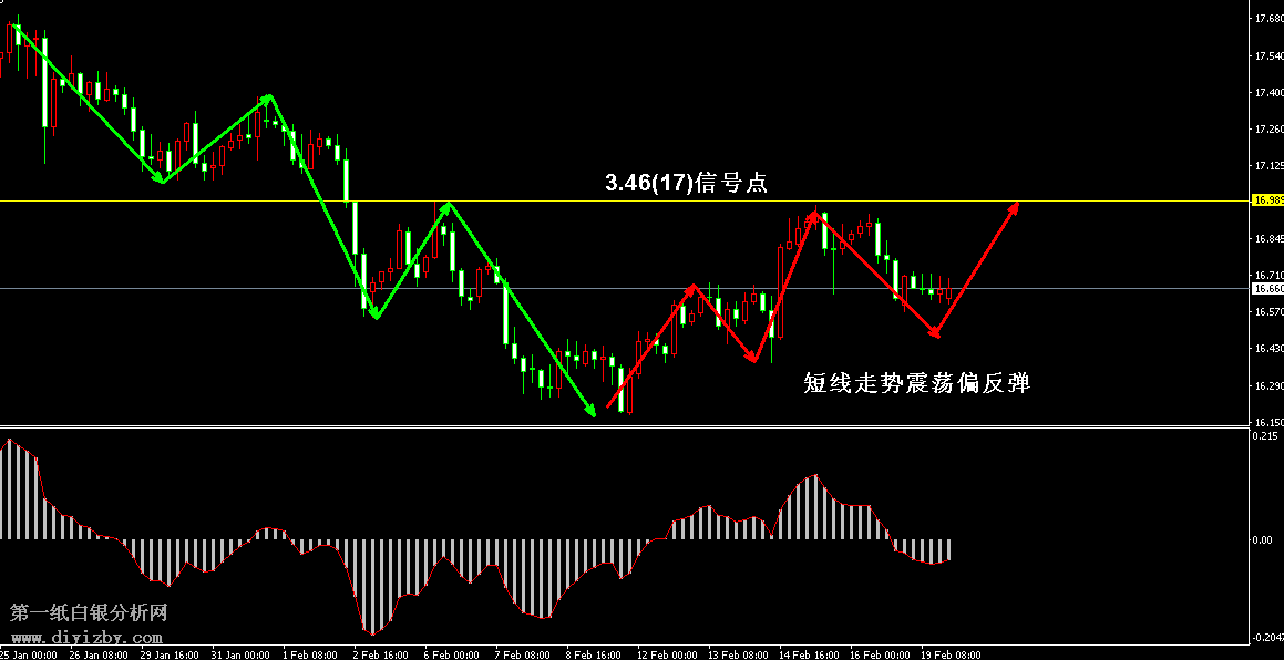 今日下方關鍵支撐位3.38(16.6)、3.36(16.5)、3.33(16.35)、3.28~3.29(16.1~16.15)、3.22(15.8)、3.16(15.6);今日上方關鍵阻力3.43(16.85)、3.46(17)、3.52~3.53(17.3~17.35)。 提示:技術僅僅是基于概率論和統計學的一種綜合分析手段,絕非預測。所以技術分析是在考慮做好止損的情況下去博取大概率事件,投資不可過于迷信技術分析。(短線操作請一定做好止損,一旦被損,代表分析師基于概率和統計的技術分析不適用于當前行情) 另外,由于紙白銀價格是國際銀價換算而來,而換算過程中涉及到人民幣對美元匯率的變化,即使在國際銀價不變化的情況下,如果人民幣貶值或升值,也會導致紙白銀價格出現變動。因此,我們的分析只采用最新的國際銀價對應的人民幣白銀價格,如與過去分析價格有出入, 投資者應知曉其原因。 1、文中價格為紙白銀價格,括號內為國際銀價,投資者可雙向參考。 2、以上所有價格為工商銀行買入價,即紙白銀低價。進倉點位要再加點差(各銀行點差不一),出倉則不要。 3、第一紙白銀給出的所有建議僅供投資者參考,不作為下單絕對依據,切勿過于依賴。 4、北京時間07:45發布此文章。 5、上一交易日白銀價格分析情況:(2月19日)白銀回踩蓄力將再次反彈 關注信號點突破