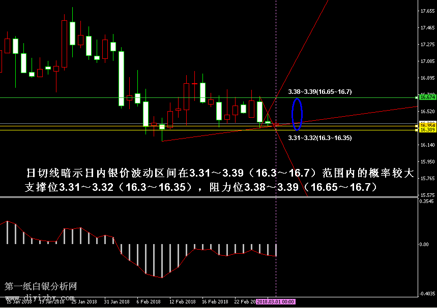 今日下方關(guān)鍵支撐位3.31~3.32(16.6~16.35)、3.29(16.2)、3.27(16.1)、3.21(15.8)、3.17(15.6);今日上方關(guān)鍵阻力3.38~3.39(16.65~16.7)、3.41~3.43(16.8~16.9)、3.45(17)、3.51~3.52(17.3~17.35)。 提示:技術(shù)僅僅是基于概率論和統(tǒng)計(jì)學(xué)的一種綜合分析手段,絕非預(yù)測(cè)。所以技術(shù)分析是在考慮做好止損的情況下去博取大概率事件,投資不可過于迷信技術(shù)分析。(短線操作請(qǐng)一定做好止損,一旦被損,代表分析師基于概率和統(tǒng)計(jì)的技術(shù)分析不適用于當(dāng)前行情) 另外,由于紙白銀價(jià)格是國(guó)際銀價(jià)換算而來,而換算過程中涉及到人民幣對(duì)美元匯率的變化,即使在國(guó)際銀價(jià)不變化的情況下,如果人民幣貶值或升值,也會(huì)導(dǎo)致紙白銀價(jià)格出現(xiàn)變動(dòng)。因此,我們的分析只采用最新的國(guó)際銀價(jià)對(duì)應(yīng)的人民幣白銀價(jià)格,如與過去分析價(jià)格有出入, 投資者應(yīng)知曉其原因。 1、文中價(jià)格為紙白銀價(jià)格,括號(hào)內(nèi)為國(guó)際銀價(jià),投資者可雙向參考。 2、以上所有價(jià)格為工商銀行買入價(jià),即紙白銀低價(jià)。進(jìn)倉(cāng)點(diǎn)位要再加點(diǎn)差(各銀行點(diǎn)差不一),出倉(cāng)則不要。 3、第一紙白銀給出的所有建議僅供投資者參考,不作為下單絕對(duì)依據(jù),切勿過于依賴。 4、北京時(shí)間08:40發(fā)布此文章。 5、上一交易日白銀價(jià)格分析情況:(2月28日)白銀超跌后偏向反彈 整體走勢(shì)仍維持震蕩