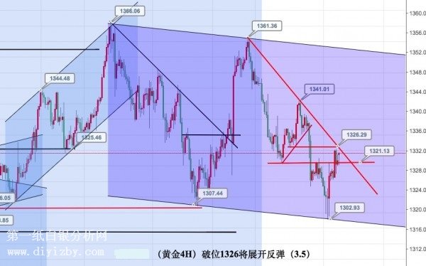 1:上周金價(jià)從1341跌至以1366為高點(diǎn)的下降通道在1302的支撐周尾震蕩走高!
