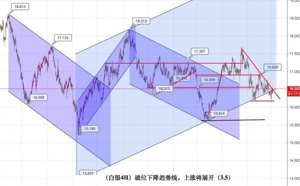 3:由此來看,美元再度面臨回落,白銀又沒有跌破前低,且如圖盤中下降趨勢(shì)線呈現(xiàn)破位的跡象,所以白銀整體走勢(shì)并不悲觀,破位下降趨勢(shì)線后多頭將展開上攻行情!