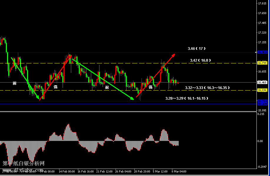 2、以上所有價格為工商銀行買入價,即紙白銀低價。進(jìn)倉點位要再加0.04,出倉則不要。 3、第一紙白銀給出的所有建議僅供投資者參考,不作為下單絕對依據(jù),切勿過于依賴。 4、北京時間09:00發(fā)布此文章。 5、上一交易日白銀價格分析情況:(3月8日)白銀不改強勢震蕩 回落中空頭力量仍減弱