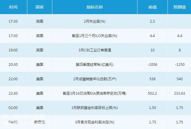 周三(3月21日)歐洲時段,投資者需關(guān)注17:30公布的英國截至1月三個月ILO失業(yè)率、英國截至1月剔除紅利三個月平均工資年率。美國時段,投資者需關(guān)注22:30公布的美國截至3月16日當周EIA原油庫存變動。