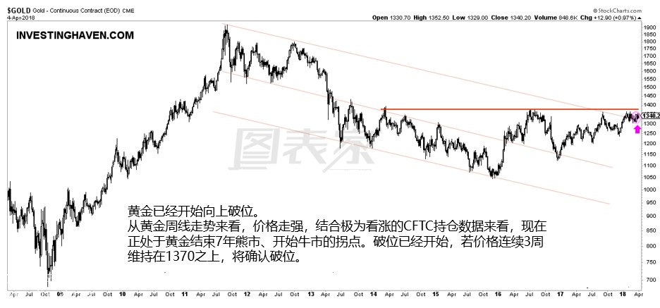 雖然近期黃金價格維持略偏盤整的走勢,但金價已經(jīng)突破了關(guān)鍵壓力位,這暗示行情在未來即將走強(qiáng),日內(nèi)非農(nóng)數(shù)據(jù)是金價走強(qiáng)的關(guān)鍵,若今日行情大幅上漲,則驗證黃金轉(zhuǎn)強(qiáng)的事實。 下圖為黃金周線走勢,價格開始走強(qiáng),目前已經(jīng)突破下降趨勢線阻力。 雖然價格依然受阻于1350,但是從CFTC持倉來看,自2016年以來,價格觸及1350時的商業(yè)機(jī)構(gòu)凈空頭持倉逐步減少,這意味著價格觸及1350時的賣盤力量越來越少,暗示黃金將以更快的速度突破1350阻力并結(jié)束7年熊市。 ![]() 查看更多紙白銀相關(guān)新聞?wù)埧矗?/span>紙白銀行情新聞