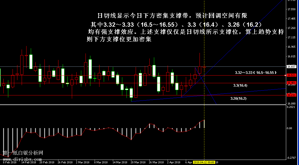今日下方關鍵支撐位3.32~3.3(16.5~16.55)、3.3(16.4)、3.26~3.28(16.2~16.3)、3.24(16.1)、3.17(15.8)、3.13(15.6);今日上方關鍵阻3.38(16.8)、3.4(16.9)、3.42(17)、3.48(17.3)。 提示:技術僅僅是基于概率論和統計學的一種綜合分析手段,絕非預測。所以技術分析是在考慮做好止損的情況下去博取大概率事件,投資不可過于迷信技術分析。(短線操作請一定做好止損,一旦被損,代表分析師基于概率和統計的技術分析不適用于當前行情) 另外,由于紙白銀價格是國際銀價換算而來,而換算過程中涉及到人民幣對美元匯率的變化,即使在國際銀價不變化的情況下,如果人民幣貶值或升值,也會導致紙白銀價格出現變動。因此,我們的分析只采用最新的國際銀價對應的人民幣白銀價格,如與過去分析價格有出入, 投資者應知曉其原因。 1、文中價格為紙白銀價格,括號內為國際銀價,投資者可雙向參考。 2、以上所有價格為工商銀行買入價,即紙白銀低價。進倉點位要再加點差(各銀行點差不一),出倉則不要。 3、第一紙白銀給出的所有建議僅供投資者參考,不作為下單絕對依據,切勿過于依賴。 4、北京時間09:05發布此文章。 5、上一交易日白銀價格分析情況:(4月11日)白銀維持上升通道運行 徐徐拉升沖擊阻力