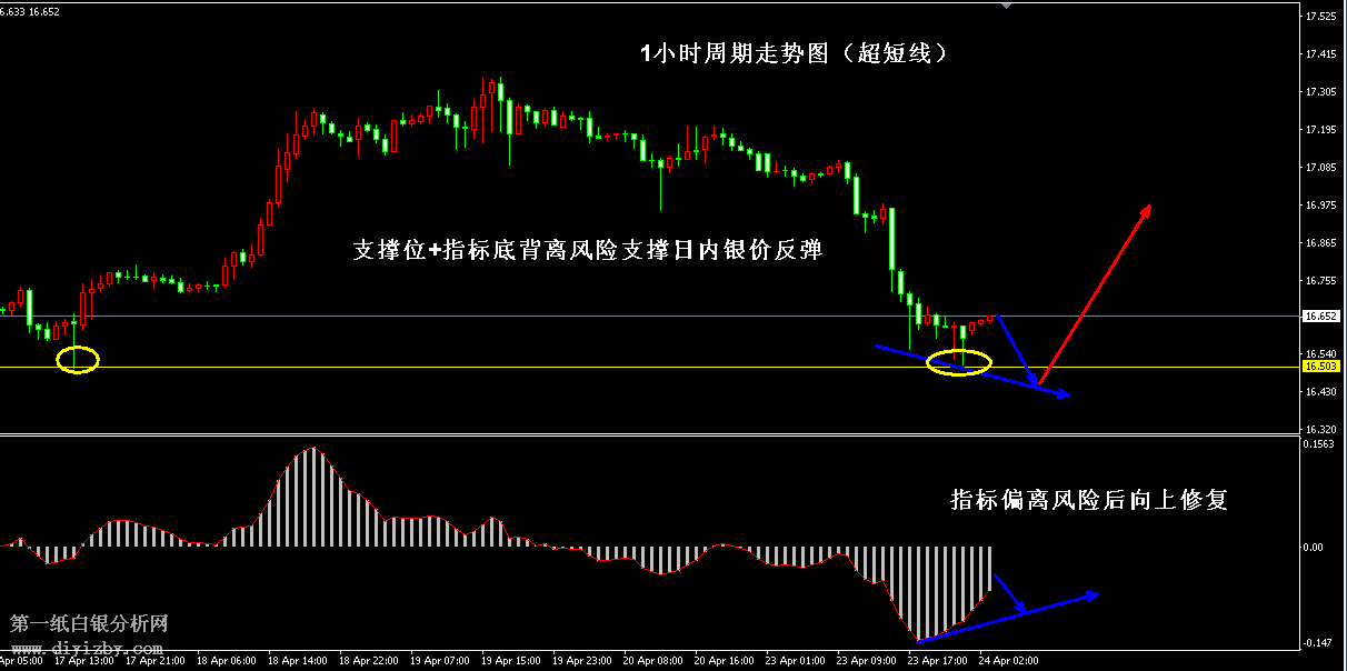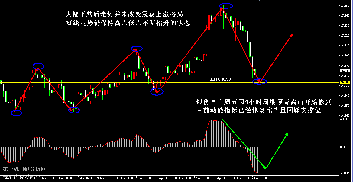 今日下方關鍵支撐位3.34(16.5)、3.32(16.4)、3.29(16.25)、3.26(16.1);今日上方關鍵阻3.48(17.15)、3.54(17.45)、3.62(17.95)。 提示:技術僅僅是基于概率論和統計學的一種綜合分析手段,絕非預測。所以技術分析是在考慮做好止損的情況下去博取大概率事件,投資不可過于迷信技術分析。(短線操作請一定做好止損,一旦被損,代表分析師基于概率和統計的技術分析不適用于當前行情) 另外,由于紙白銀價格是國際銀價換算而來,而換算過程中涉及到人民幣對美元匯率的變化,即使在國際銀價不變化的情況下,如果人民幣貶值或升值,也會導致紙白銀價格出現變動。因此,我們的分析只采用最新的國際銀價對應的人民幣白銀價格,如與過去分析價格有出入, 投資者應知曉其原因。 1、文中價格為紙白銀價格,括號內為國際銀價,投資者可雙向參考。 2、以上所有價格為工商銀行買入價,即紙白銀低價。進倉點位要再加點差(各銀行點差不一),出倉則不要。 3、第一紙白銀給出的所有建議僅供投資者參考,不作為下單絕對依據,切勿過于依賴。 4、北京時間09:00發布此文章。 5、上一交易日白銀價格分析情況:(4月23日)白銀調整后將延續上漲 多頭空間仍較大