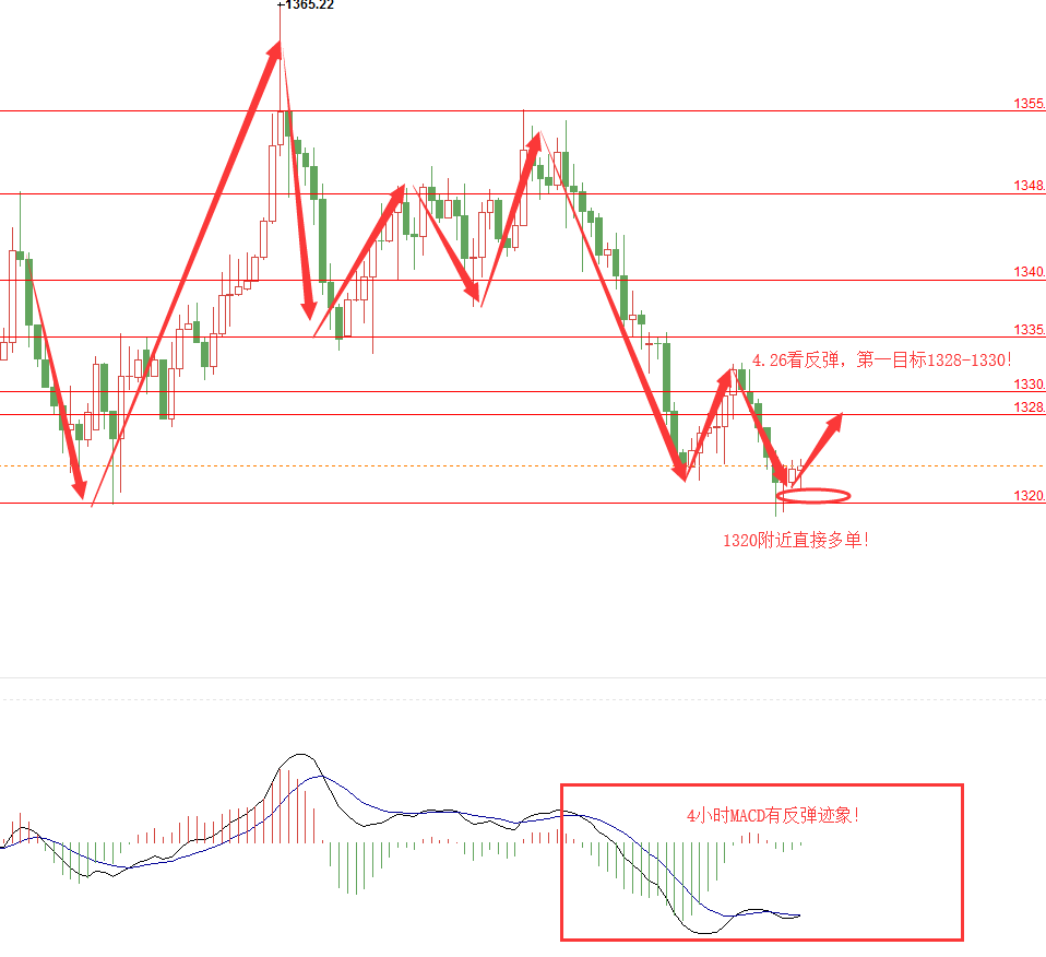 1、1320附近做多,止損1316,目標(biāo)1328-1330一線!