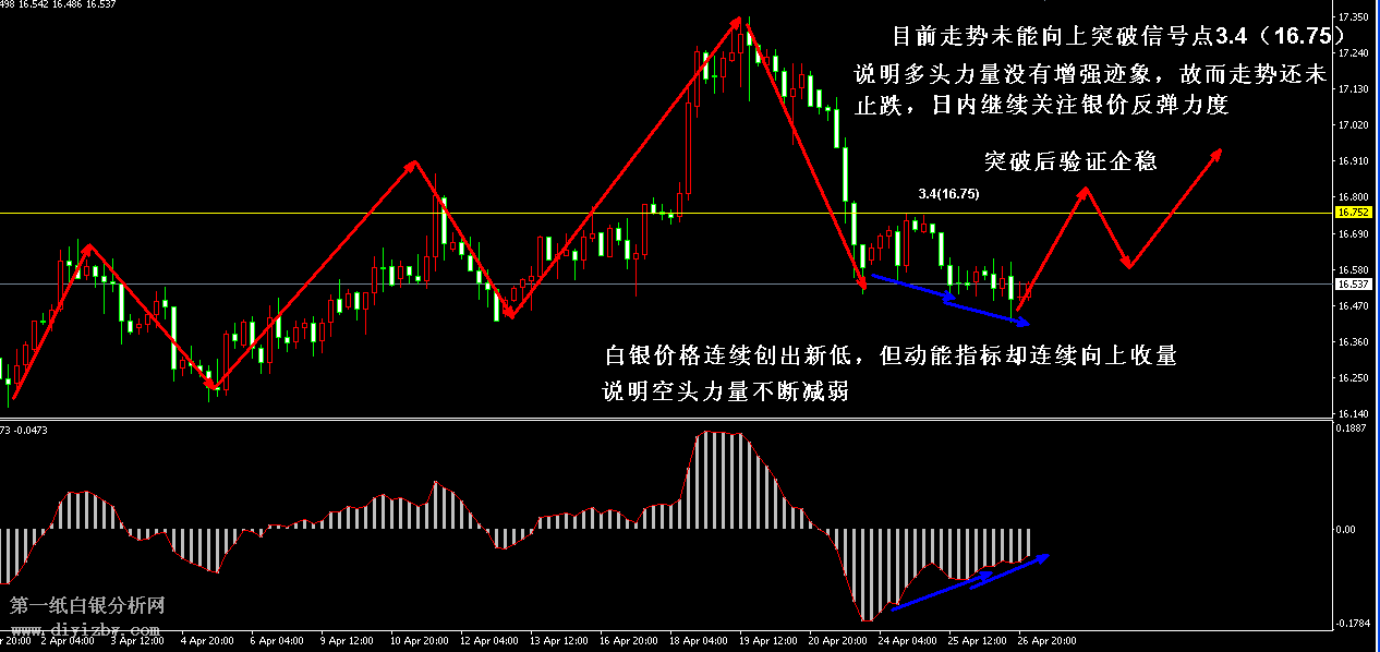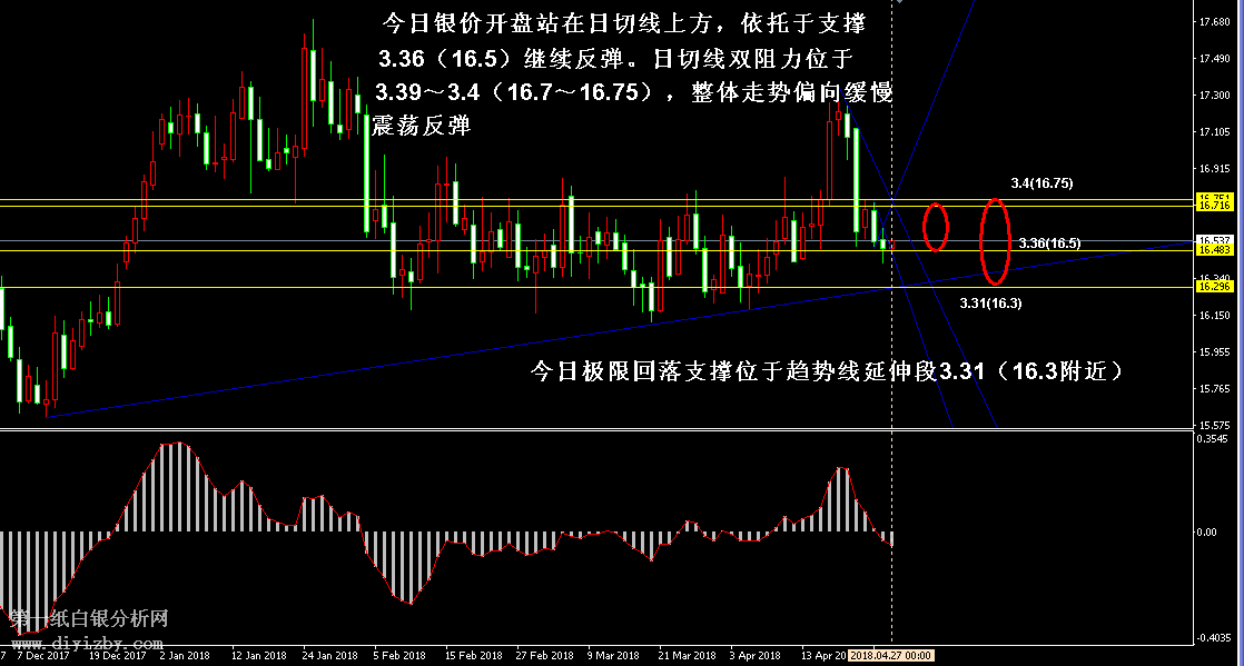 今日下方關(guān)鍵支撐位3.33~3.35(16.4~16.5)、3.3~3.31(16.25~16.3)、3.26(16.1);今日上方關(guān)鍵阻3.39~3.4(16.7~16.75)、3.47~3.48(17.1~17.15)、3.55(17.45)、3.65(17.95)。 提示:技術(shù)僅僅是基于概率論和統(tǒng)計(jì)學(xué)的一種綜合分析手段,絕非預(yù)測。所以技術(shù)分析是在考慮做好止損的情況下去博取大概率事件,投資不可過于迷信技術(shù)分析。(短線操作請一定做好止損,一旦被損,代表分析師基于概率和統(tǒng)計(jì)的技術(shù)分析不適用于當(dāng)前行情) 另外,由于紙白銀價(jià)格是國際銀價(jià)換算而來,而換算過程中涉及到人民幣對美元匯率的變化,即使在國際銀價(jià)不變化的情況下,如果人民幣貶值或升值,也會導(dǎo)致紙白銀價(jià)格出現(xiàn)變動。因此,我們的分析只采用最新的國際銀價(jià)對應(yīng)的人民幣白銀價(jià)格,如與過去分析價(jià)格有出入, 投資者應(yīng)知曉其原因。 1、文中價(jià)格為紙白銀價(jià)格,括號內(nèi)為國際銀價(jià),投資者可雙向參考。 2、以上所有價(jià)格為工商銀行買入價(jià),即紙白銀低價(jià)。進(jìn)倉點(diǎn)位要再加點(diǎn)差(各銀行點(diǎn)差不一),出倉則不要。 3、第一紙白銀給出的所有建議僅供投資者參考,不作為下單絕對依據(jù),切勿過于依賴。 4、北京時(shí)間09:00發(fā)布此文章。 5、上一交易日白銀價(jià)格分析情況:(4月26日)白銀底背離+強(qiáng)支撐 多空轉(zhuǎn)變正醞釀企穩(wěn)