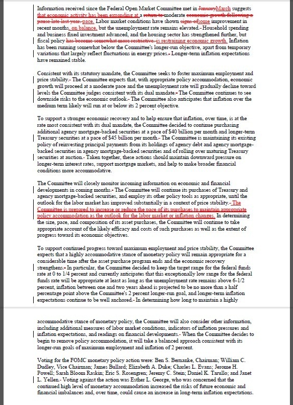 FT的報(bào)道認(rèn)為,由于美聯(lián)儲(chǔ)此前的會(huì)議紀(jì)要中都暗示可能削減其月度購(gòu)債規(guī)模。隨著對(duì)其購(gòu)債措施轉(zhuǎn)向更加中立的立場(chǎng),美聯(lián)儲(chǔ)愿意增加其每月850億美元的購(gòu)債規(guī)模。 “美國(guó)4月ADP就業(yè)僅增加11.9萬(wàn)人,降至七個(gè)月最低水平”http://t.cn/zTOZTaW; “美國(guó)3月CPI四個(gè)月來(lái)首次下降后,美聯(lián)儲(chǔ)最重視的通脹指標(biāo)——個(gè)人消費(fèi)支出(PCE)再次顯示通縮跡象。3月PCE與核心PCE僅分別同比增長(zhǎng)了1%和1.1%。”http://t.cn/zT0RnIx FOMC委員會(huì)決議原文鏈接。 以下為本次FOMC會(huì)后聲明與3月份會(huì)議會(huì)后聲明的異同(紅字部分為不同之處)