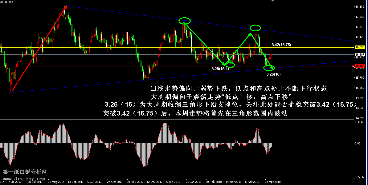 目前白銀價格是3.371元/克(16.507美元/盎司)。上周五銀價小幅上漲,受到非農數據利多貴金屬的影響,白銀僅在阻力位小幅回落后便收復跌幅,不過目前走勢仍未突破3.42(16.75)的信號點,行情還未奠定止跌企穩形態,在突破該點位之前,建議投資者暫時以高拋為主,低吸為輔,突破后走勢將由偏弱的下跌格局轉入震蕩行情。如下圖所示為白銀日線走勢圖,如圖中綠色箭頭所示,當前日線走勢正處于偏弱的下跌形態之中,自近期行情向下破位3.28(16.1)的前期低點后,走勢便形成了圖中綠色箭頭所示的震蕩下跌形態,其高點和低點都處于不斷下移的狀態,若此形態不能被破壞,受到趨勢延續性的影響,行情將有望繼續延續跌勢并不斷創出新低。故而在當前行情未釋放止跌企穩信號之前,建議投資者可暫時以高拋為主,低吸為輔。日內應密切關注多空信號點3.42(16.75)的突破情況,此處為短線行情破位3.28(16.1)前低的發起點,可定義該點位為信號點,若行情反彈不能突破此處,則投資者需謹防走勢沖高回落后可能再創新低,這符合圖中綠色箭頭所示的短期趨勢特征;反之,若銀價突破信號點,則走勢將打破短線下跌形態,繼而行情有望順應大周期所示的收縮三角形運行。大周期銀價正處于“高點不斷下移,低點不斷上移”的收縮三角形內波動,行情偏向于震蕩走勢,屆時銀價將在三角形范圍內波動,本周三角形區間位于3.26~3.55(16~17.4)之間,待行情突破3.42(16.75)后,投資者可在上述區間內進行高拋低吸,而后耐心等待銀價對于區間的突破,這將決定行情下一步方向選擇。若最終向上突破3.44(17.4),則短線走勢將完成由“下跌--震蕩--上漲”的變化,各大趨勢均將進入上漲形態;若屆時行情向下跌破3.4(16),則走勢將完成“下跌--震蕩--下跌”的變化,行情雖經歷短暫企穩后,但銀價再度轉入弱勢。綜合分析:投資者應先關注日線短期走勢的止跌可能性,若突破信號點后將奠定短時間內行情將不會跌破3.26(16)的事實。而后銀價將順應日線中期走勢陷入收縮三角形震蕩,屆時投資者可關注三角形上沿和下沿組成的震蕩區間,首先在震蕩區間內操作,而后突破區間后可順勢跟進。目前走勢的各大趨勢并不相同,但行情將先以短期趨勢為主要波動方向,而后若短期趨勢不能延續,則才將順應更大周期的形態波動。
