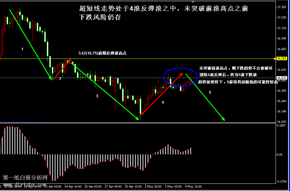 白銀短線分析:(波段:觀望;短線:高拋為主,低吸為輔,關注信號點突破)。 從超短線走勢形態來看,銀價正處于4浪反彈之中,在4浪反彈未突破信號點之前,走勢仍有可能沖高回落并再創新低。如下圖所示為白銀4小時周期走勢圖,超短線行情正如圖中紅綠箭頭交替所示,以綠色箭頭為短線主趨勢不斷向下運行,而紅色箭頭僅僅為反彈浪形態。每一次銀價下跌都創出新低,而反彈卻未能突破前浪高點,這是典型的下跌趨勢延續的特征。近期行情雖然持續反彈,但正處于圖中右側紅色箭頭所示的反彈浪之中,其還未突破3.42(16.75)的前期高點,因此下跌趨勢未被破壞。目前走勢正在3.38~3.39(16.55~16.6)的趨勢阻力位附近徘徊,此處如圖中藍色圈所示,仍有可能發生沖高回落的風險,若下跌趨勢延續,則投資者需謹防4浪向5浪的轉換,當走勢轉入5浪下跌后,隨著趨勢延續性,5浪下跌將有望向下創出新低的可能性仍然較高。因此,近期投資者務必在銀價突破3.42(16.75)信號點,打破短線下跌趨勢后,方可開始做多,否則應以高拋為主思路。