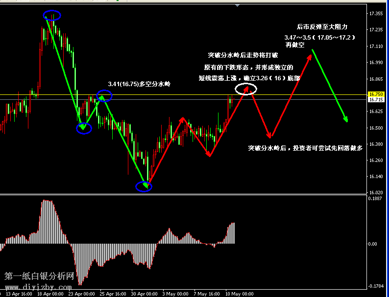今日下方關鍵支撐3.37(16.55)、3.34(16.4)、3.3~3.31(16.2~16.25)、3.27(16);今日上方關鍵阻3.41(16.75)、3.47~3.5(17.05~17.2)、3.54(17.4)。 提示:技術僅僅是基于概率論和統計學的一種綜合分析手段,絕非預測。所以技術分析是在考慮做好止損的情況下去博取大概率事件,投資不可過于迷信技術分析。(短線操作請一定做好止損,一旦被損,代表分析師基于概率和統計的技術分析不適用于當前行情) 另外,由于紙白銀價格是國際銀價換算而來,而換算過程中涉及到人民幣對美元匯率的變化,即使在國際銀價不變化的情況下,如果人民幣貶值或升值,也會導致紙白銀價格出現變動。因此,我們的分析只采用最新的國際銀價對應的人民幣白銀價格,如與過去分析價格有出入, 投資者應知曉其原因。 1、文中價格為紙白銀價格,括號內為國際銀價,投資者可雙向參考。 2、以上所有價格為工商銀行買入價,即紙白銀低價。進倉點位要再加點差(各銀行點差不一),出倉則不要。 3、第一紙白銀給出的所有建議僅供投資者參考,不作為下單絕對依據,切勿過于依賴。 4、北京時間07:20發布此文章。 5、上一交易日白銀價格分析情況:(5月10日)白銀連續收十字星 行情等待突破指引方向