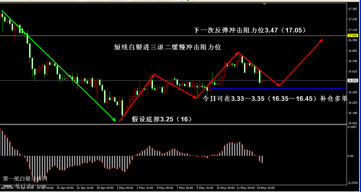 今日下方關鍵支撐3.33~3.35(16.35~16.45)、3.29~3.3(16.2~16.25)、3.25~3.26(16~16.05);今日上方關鍵阻3.47~3.5(17.05~17.2)、3.52(17.3)。 提示:技術僅僅是基于概率論和統計學的一種綜合分析手段,絕非預測。所以技術分析是在考慮做好止損的情況下去博取大概率事件,投資不可過于迷信技術分析。(短線操作請一定做好止損,一旦被損,代表分析師基于概率和統計的技術分析不適用于當前行情) 另外,由于紙白銀價格是國際銀價換算而來,而換算過程中涉及到人民幣對美元匯率的變化,即使在國際銀價不變化的情況下,如果人民幣貶值或升值,也會導致紙白銀價格出現變動。因此,我們的分析只采用最新的國際銀價對應的人民幣白銀價格,如與過去分析價格有出入, 投資者應知曉其原因。 1、文中價格為紙白銀價格,括號內為國際銀價,投資者可雙向參考。 2、以上所有價格為工商銀行買入價,即紙白銀低價。進倉點位要再加點差(各銀行點差不一),出倉則不要。 3、第一紙白銀給出的所有建議僅供投資者參考,不作為下單絕對依據,切勿過于依賴。 4、北京時間09:00發布此文章。 5、上一交易日白銀價格分析情況:(5月14日)白銀進入震蕩形態 延續反彈考驗區間阻力