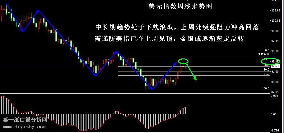 白銀短線分析:(波段:持倉觀望;短線:先低吸,后高拋)。 對于白銀的后市的走勢我們仍然持樂觀態度,特別近期美元指數可能出現見頂風險,這令金銀繼續看漲的可能性大幅增高。如下圖所示為美元指數周線走勢圖,從長期形態來看,美元指數在近兩年一直處于震蕩下跌格局之中,圖中藍色箭頭顯示自2016年12月起,美指便開啟了下跌之路,始終保持了“高點低點不斷下降”的浪型特征。雖然2018年初至今美指處于上漲形態,但從圖中浪型來看,這只不過是下跌趨勢中的一次簡單的反彈修復。直至上周,美元指數觸及了93.5的關鍵阻力位,此處是周線黃金分割線23.6%的強壓位置,而后其最終發生沖高回落。圖中綠色圈顯示上周美指在強阻力沖高回落,最終形成了上影線的十字星陰線。阻力位附近的強勢回落+趨勢本身處于下跌,投資者需謹防美元指數已經見頂的風險,若后市美指重啟跌勢,則依據浪型推測,其價格再次向下創出新低的可能性較高,美元恢復跌勢后,將有助于金銀企穩反轉并開啟真正的上漲行情。(近期投資者可關注美元指數的走勢狀況)
