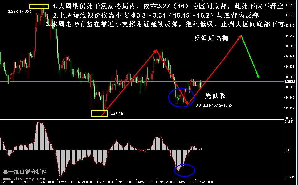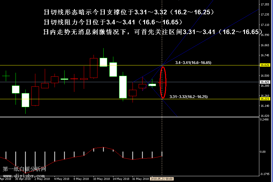 今日下方關鍵支撐3.31(16.2)、3.27~3.29(16~16.1);今日上方關鍵阻3.41(16.65)、3.49(17.05)、3.53(17.25)、3.55(17.35)。 提示:技術僅僅是基于概率論和統計學的一種綜合分析手段,絕非預測。所以技術分析是在考慮做好止損的情況下去博取大概率事件,投資不可過于迷信技術分析。(短線操作請一定做好止損,一旦被損,代表分析師基于概率和統計的技術分析不適用于當前行情) 另外,由于紙白銀價格是國際銀價換算而來,而換算過程中涉及到人民幣對美元匯率的變化,即使在國際銀價不變化的情況下,如果人民幣貶值或升值,也會導致紙白銀價格出現變動。因此,我們的分析只采用最新的國際銀價對應的人民幣白銀價格,如與過去分析價格有出入, 投資者應知曉其原因。 1、文中價格為紙白銀價格,括號內為國際銀價,投資者可雙向參考。 2、以上所有價格為工商銀行買入價,即紙白銀低價。進倉點位要再加點差(各銀行點差不一),出倉則不要。 3、第一紙白銀給出的所有建議僅供投資者參考,不作為下單絕對依據,切勿過于依賴。 4、北京時間09:00發布此文章。 5、上一交易日白銀價格分析情況:(5月18日)白銀守穩支撐緩慢反彈 多空疲軟難逃震蕩