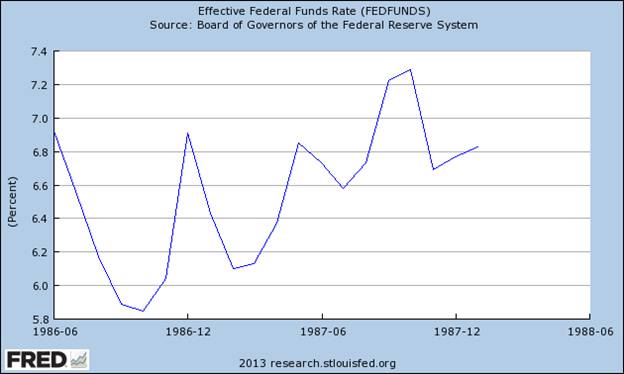 它不是直到1974年中期,美聯儲開始降低利率和放松錢。雖然花了大約6個月,收到預期的效果,到1975年,道瓊斯指數展開了反彈,1976年初已經完全回顧了1973年至1974年下降。 下一個主要的崩潰,當然是1987年10月股市暴跌,親眼目睹了1天下降了22%,在道瓊斯指數。毫不奇怪,10月'87崩潰之前上升的聯邦基金利率在今年崩潰之前。有效率為7.3%左右,上升約5.8%的速度增長,在飛機墜毀前,當時的崩潰。