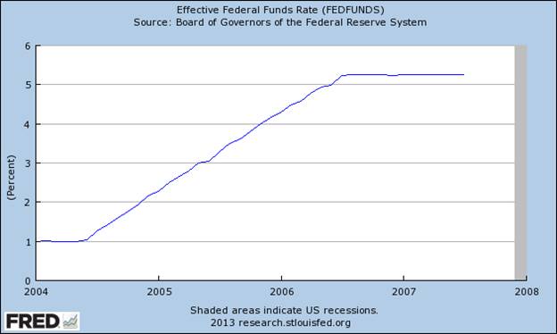 到目前為止,最令人震驚的例子發生在2004年和2007年之間的時期,美聯儲濫用權力造出一種金融崩潰。這是3年期,過渡到2007-2009年的信貸危機。美國聯邦儲備委員會的主持下,格林斯潘將利率上調1%,2004年到2006年剛剛超過5%。價格再留在這個級別,另一前一年減少。然而,到那個時候,損壞已完成,它是太少,太晚。