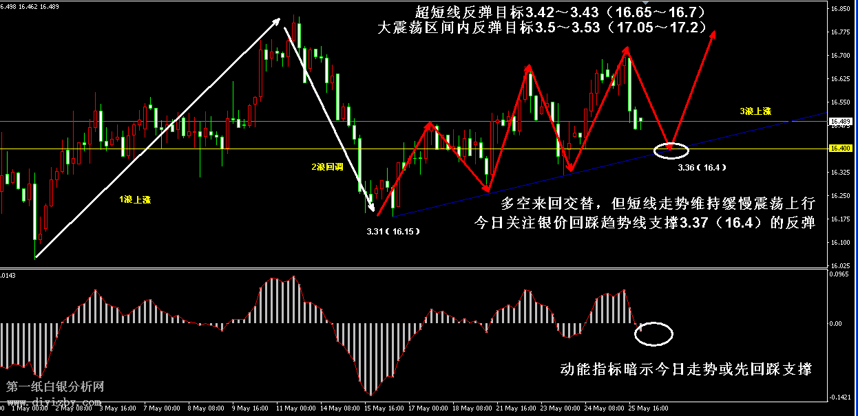 今日下方關鍵支撐3.36(16.4)、3.31~3.32(16.15~16.2)、3.28(16);今日上方關鍵阻3.41~3.42(16.65~16.7)、3.5~3.53(17.05~17.2)、3.56(17.35)。 提示:技術僅僅是基于概率論和統計學的一種綜合分析手段,絕非預測。所以技術分析是在考慮做好止損的情況下去博取大概率事件,投資不可過于迷信技術分析。(短線操作請一定做好止損,一旦被損,代表分析師基于概率和統計的技術分析不適用于當前行情) 另外,由于紙白銀價格是國際銀價換算而來,而換算過程中涉及到人民幣對美元匯率的變化,即使在國際銀價不變化的情況下,如果人民幣貶值或升值,也會導致紙白銀價格出現變動。因此,我們的分析只采用最新的國際銀價對應的人民幣白銀價格,如與過去分析價格有出入, 投資者應知曉其原因。 1、文中價格為紙白銀價格,括號內為國際銀價,投資者可雙向參考。 2、以上所有價格為工商銀行買入價,即紙白銀低價。進倉點位要再加點差(各銀行點差不一),出倉則不要。 3、第一紙白銀給出的所有建議僅供投資者參考,不作為下單絕對依據,切勿過于依賴。 4、北京時間09:00發布此文章。 5、上一交易日白銀價格分析情況:(5月26日)周評:白銀短線多頭仍占優 下周將延續反彈